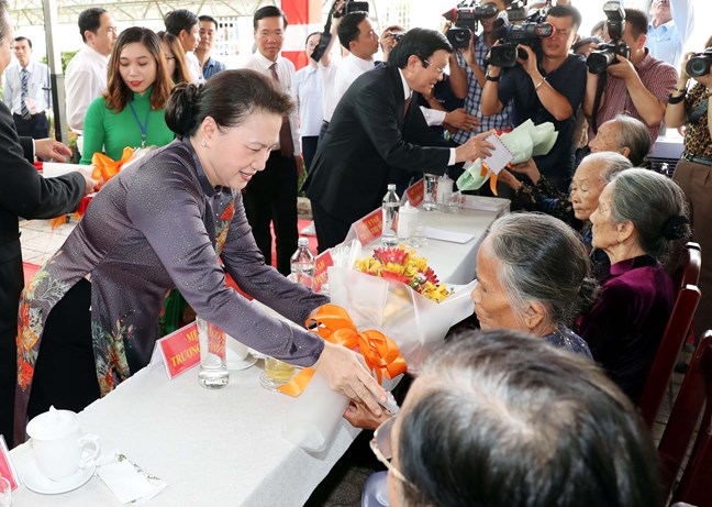 Chủ tịch Quốc hội Nguyễn Thị Kim Ngân và Đoàn công tác của Quốc hội tặng hoa và quà các mẹ Việt Nam Anh hùng tại Lễ kỷ niệm. Ảnh: Trọng Đức