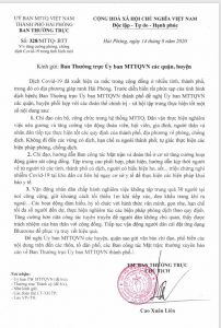 Dịch Covid-19 đã xuất hiện ca mắc trong cộng đồng ở nhiều tỉnh, thành phố, trong đó có địa phương giáp ranh Hải Phòng. Trước diễn biến rất phức tạp của tình hình dịch bệnh; vừa qua, Ban Thường trực Ủy ban MTTQVN thành phố ban hành Công văn số 328/MTTQ- BTT về việc tăng cường phòng, chống dịch Covid-19 trong tình hình mới. Theo đó, Ban Thường trực Ủy ban MTTQVN thành phố đề nghị Ủy ban MTTQVN các quận, huyện phối hợp với các đoàn thể chính trị – xã hội tập trung thực hiện tốt một số nội dung sau: