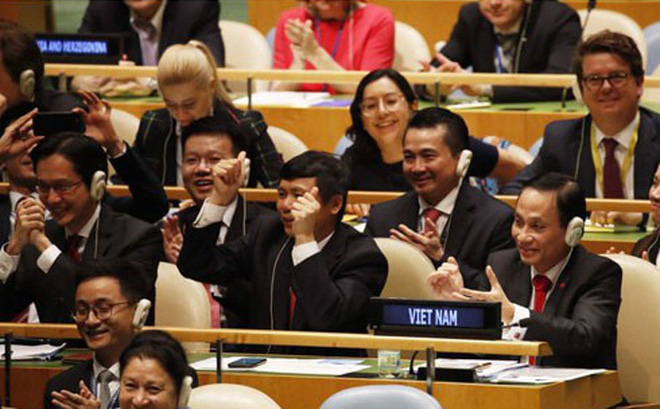 Đoàn Việt Nam khi Đại hội đồng Liên hợp quốc công bố nước ta trúng cử Ủy viên không thường trực Hội đồng Bảo an với số phiếu cao gần tuyệt đối 192/193 phiếu