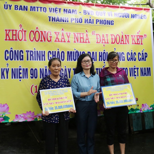 Phó Chủ tịch Ủy ban MTTQVN thành phố Vũ Anh Thư trao kinh phí hỗ trợ xây dựng nhà đại đoàn kết cho các hộ gia đình