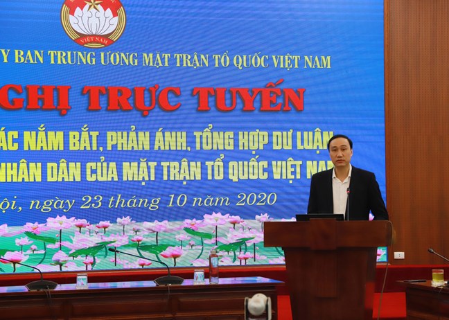 Sáng 23/10, tại Hà Nội, Ban Thường trực UBTƯ MTTQ Việt Nam tổ chức Hội nghị Trực tuyến Tập huấn công tác nắm bắt, phản ánh, tổng hợp dư luận xã hội, tình hình nhân dân của MTTQ Việt Nam cho đội ngũ cán bộ Mặt trận các cấp. Phó Chủ tịch UBTƯ MTTQ Việt Nam Phùng Khánh Tài chủ trì Hội nghị.