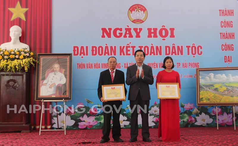 Đồng chí Phạm Quốc Ka, Bí thư Huyện ủy Vĩnh Bảo trao danh hiệu Thôn văn hóa cho thôn Vinh Quang