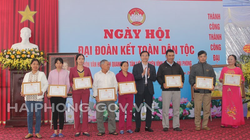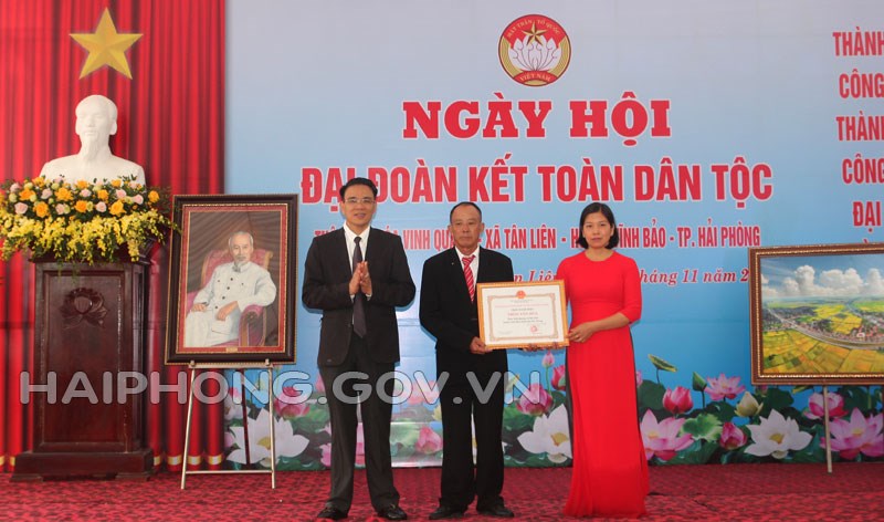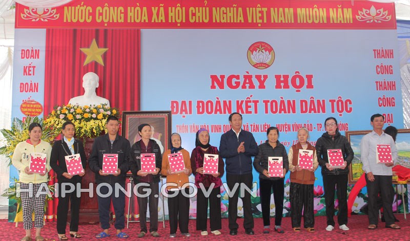 Hòa chung không khí phấn khởi chào mừng kỷ niệm 90 năm Ngày thành lập Mặt trận Dân tộc thống nhất Việt Nam – Ngày truyền thống Mặt trận Tổ quốc Việt Nam (18/11/1930 – 18/11/2020), sáng 15/11, đồng chí Lê Văn Thành, Ủy viên Trung ương Đảng, Bí thư Thành ủy, Chủ tịch HĐND thành phố dự Ngày hội “Đại đoàn kết toàn dân tộc” tại làng văn hóa thôn Vinh Quang, xã Tân Liên, huyện Vĩnh Bảo. Cùng dự có các đồng chí: Cao Xuân Liên, Ủy viên Ban Thường vụ Thành ủy, Chủ tịch Ủy ban MTTQ Việt Nam thành phố; Nguyễn Đức Thọ, Ủy viên Thành ủy, Phó Chủ tịch UBND thành phố và đông đảo nhân dân địa phương.