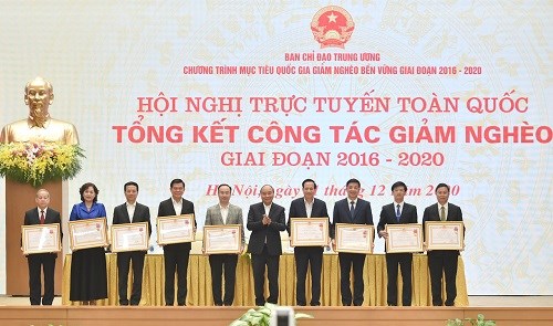 Tại buổi lễ, Thủ tướng Nguyễn Xuân Phúc thừa ủy quyền của Chủ tịch nước trao thưởng Huân chương Lao động cho 9 tập thể có thành tích xuất sắc trong thực hiện Chương trình mục tiêu quốc gia giảm nghèo bền vững giai đoạn 2016-2020 và phong trào “Cả nước chung tay vì người nghèo – Không để ai bị bỏ lại phía sau”.