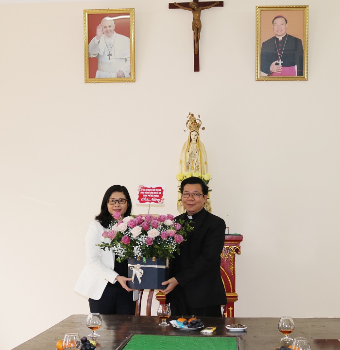 Phó Chủ tịch Ủy ban MTTQVN thành phố Vũ Anh Thư tặng hoa, quà Linh mục Trần Đức Thảo