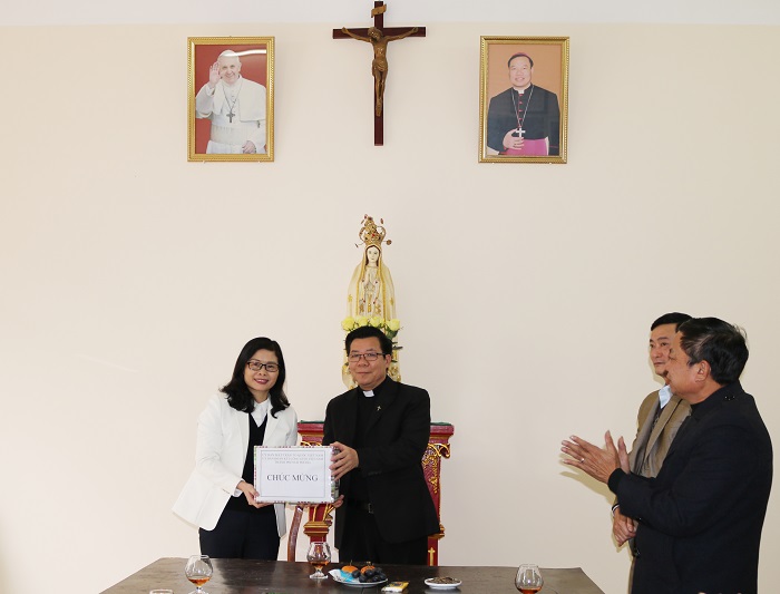 Phó Chủ tịch Ủy ban MTTQVN thành phố Vũ Anh Thư tặng quà Linh mục Khổng Minh Số