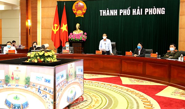 Phát biểu tại điểm cầu Hải Phòng, Chủ tịch UBND thành phố Nguyễn Văn Tùng báo cáo về 3 ca F0 đang được cách ly, điều trị tại cơ sở 2 bệnh viện Hữu nghị Việt Tiệp, trong đó xác định chủng vi rút từ Cẩm Giang, Hải Dương. Để ứng phó kịp thời và hiệu quả trong công tác phòng, chống dịch bệnh COVID-19, thành phố đã khởi động 2.500 Tổ phòng, chống COVID19 tại thôn, tổ dân phố với trên 30.000 người tham gia. Thực hiện truy vết F1 đối với 3 ca dương tính, xét nghiệm 368 mẫu, kết quả đều âm tính, lấy mẫu F2 và người dân trong các khu dân cư 2.700 mẫu, kết quả âm tính. Thành phố quyết định phong tỏa tại 3 khu vực: Bệnh viện Giao thông vận tải, phường Hùng Vương, quận Hồng Bàng; xóm 4, thôn Lôi Động, xã Hoàng Động, huyện Thủy Nguyên; Lô 112 khu công nhân Dư Hàng, phố Chợ Cột Đèn, đường Dư Hàng, phường Dư Hàng, quận Lê Chân. Tổng số trên 600 hộ gia đình với 2.500 nhân khẩu. Thực hiện giãn cách xã hội theo Chỉ thị 16 của Thủ tướng đối với 1 xã, 1 phường có ca dương tính và 1 thôn giáp xã có dịch Hải Dương. Toàn thành phố thực hiện giãn cách xã hội theo Chỉ thị 15 của Thủ tướng. Đã chuẩn bị 5.000 giường để phục vụ công tác cách ly tập trung.