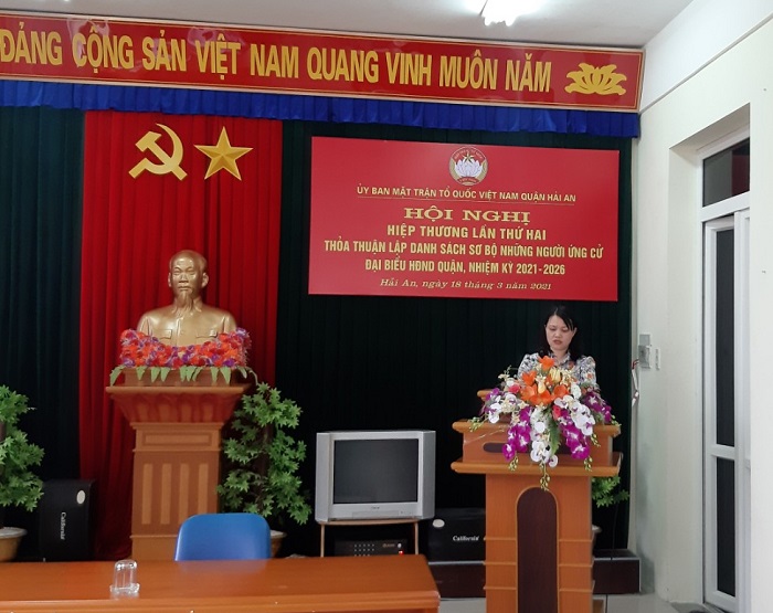 Chiều ngày 18/3/2021, Ban Thường trực Ủy ban MTTQ Việt Nam quận tổ chức hội nghị hiệp thương lần thứ hai lập danh sách sơ bộ những người ứng cử đại biểu HĐND quận, nhiệm kỳ 2021-2026. Tới dự có các đồng chí Nguyễn Ngọc Tuất, Phó Bí thư Thường trực Quận ủy; Nguyễn Trọng Khiêm, Ủy viên BTV- Phó Chủ tịch HĐND quận; Phạm Thị Chuyên, Ủy viên BTV- Trưởng Ban Dân vận- Chủ tịch UB MTTQVN quận chủ trì hội nghị; cùng dự có các đồng chí đại diện lãnh đạo Ban Tổ chức Quận ủy, phòng Nội vụ quận, Ban Dân vận Quận ủy, đại diện các tổ chức thành viên của Ủy ban MTTQ Việt Nam quận.
