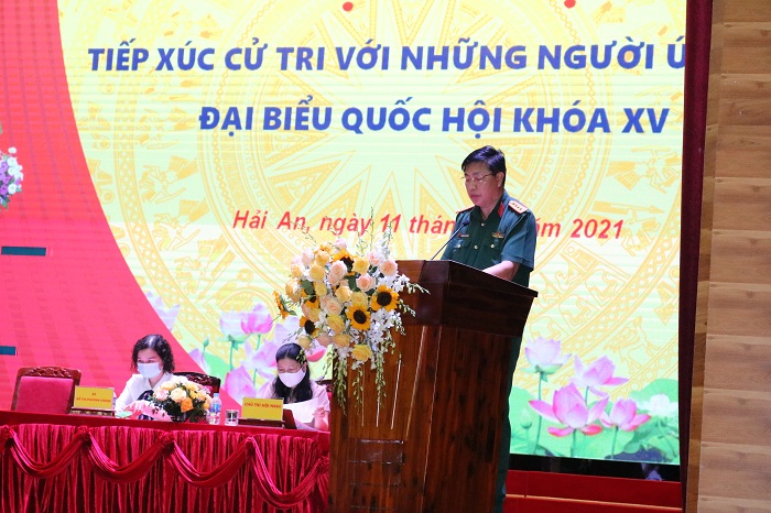 Tại Hội nghị, đồng chí Nguyễn Thị Minh Phương, Phó Chủ tịch Ủy ban MTTQ Việt Nam thành phố đã giới thiệu tiểu sử tóm tắt của 5 đồng chí ứng cử đại biểu Quốc hội khóa XV gồm các đồng chí: Nguyễn Chu Hồi – Phó Chủ tịch Thường trực Hội Nghề cá Việt Nam; Đại tá Nguyễn Minh Quang Ủy viên BTV Thành ủy, Chỉ huy trưởng Bộ Chỉ huy Quân sự thành phố; Lã Thanh Tân, Bí thư Đảng ủy- Giám đốc Sở Tư pháp thành phố; Đỗ Thị Phương Chung, Trưởng khoa ung bướu cơ sở An Đồng, Phó Giám đốc Trung tâm Ung bướu – Y học hạt nhân, Bệnh viện Hữu nghị Việt Tiệp; Nguyễn Thị Thanh Diệp, Ủy viên BCH Đảng bộ, Phó Hiệu trưởng Trường Trung học phổ thông Lê Quý Đôn; các ứng cử viên trình bày chương trình hành động của mình trước các cử tri quận Hải An.
