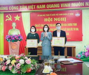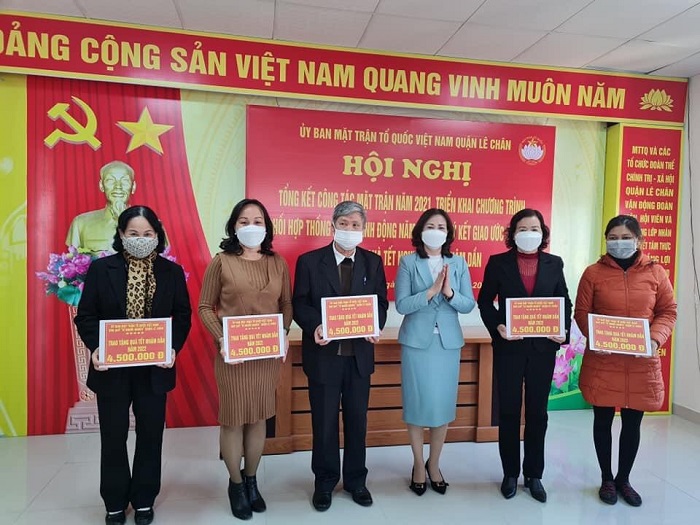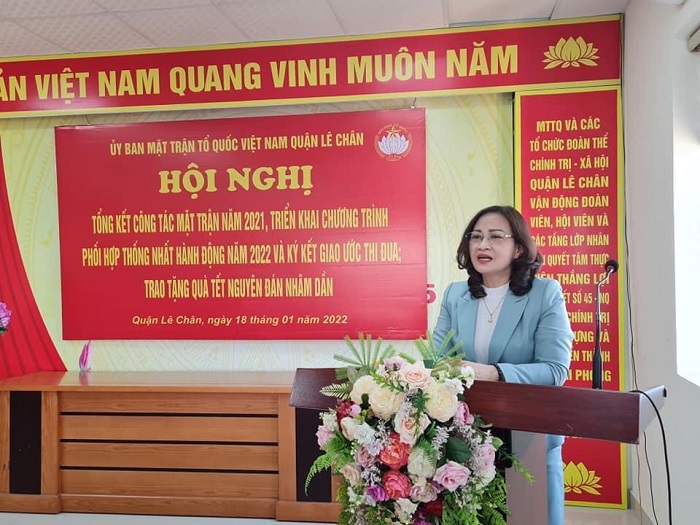 Chiều ngày 18/1/2022, Ủy ban Mặt trận Tổ quốc quận Lê Chân tổ chức Hội nghị Tổng kết công tác Mặt trận năm 2021, thống nhất Chương trình phối hợp hành động năm 2022; ký kết giao ước thi đua và trao quà Tết Nguyên đán Nhâm Dần 2022. Dự Hội nghị có đồng chí Bùi Thị Thu Phương – Ủy viên Ban Thường vụ Quận ủy, Trưởng Ban Dân vận, Chủ tịch Ủy ban MTTQ Việt Nam quận; các đồng chí trong Ban Thường trực Uỷ ban MTTQ Việt Nam quận; đại diện lãnh đạo Ban Dân vận Quận ủy; các đồng chí Chủ tịch Ủy ban MTTQ Việt Nam, Trưởng khối Dân vận 15 phường.