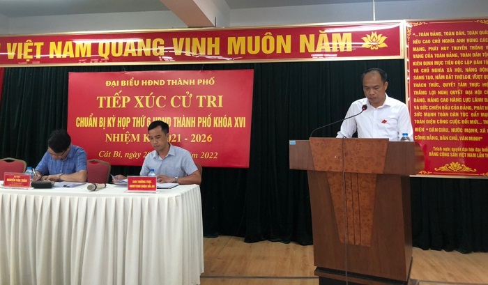 Sáng ngày 28/6/2022, tại quận Hải An, tổ đại biểu HĐND thành phố tiếp xúc với cử tri tại phường Cát Bi và phường Tràng Cát để chuẩn bị cho kỳ họp thứ 6, HĐND thành phố khóa XVI, nhiệm kỳ 2021-2026. Dự tiếp xúc tại điểm phường Tràng Cát có các đồng chí: Cao Xuân Liên – Ủy viên Ban Thường vụ, Chủ tịch Ủy ban MTTQVN thành phố; Phạm Hồng Minh – Bí thư Đảng ủy, Chủ tịch HĐQT Công ty cổ phần Cảng Hải Phòng; Nguyễn Anh Tuân – Thành ủy viên, Giám đốc Sở Ngoại vụ. Tại điểm phường Cát Bi có các đồng chí: Nguyễn Văn Tuấn – Thành ủy viên- Bí thư Quận ủy- Chủ tịch HĐND quận; Lê Quốc Tiến- Thành ủy viên–Trưởng ban Ban Văn hóa-Xã hội, HĐND thành phố. Về phía quận Hải An có các đồng chí Dương Đình Ổn – Phó Bí thư Quận ủy-Chủ tịch UBND quận; Hoàng Hải Bằng-UVBTV, Phó Chủ tịch HĐND quận; Trần Thị Kim Oanh-QUV, Phó Chủ tịch UBND quận và đại diện cử tri các phòng, ban, ngành, đoàn thể và cử tri 08 phường.