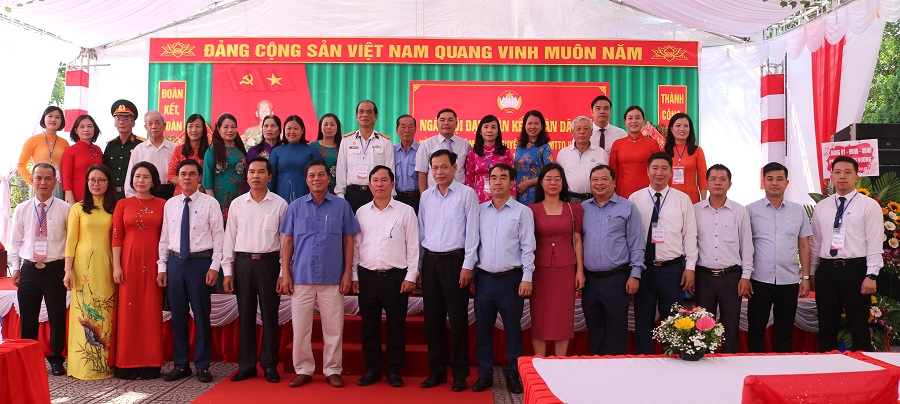 Các đồng chí lãnh đạo thành phố cùng cán bộ và nhân dân phường Hùng Vương chụp ảnh lưu niệm tại ngày hội