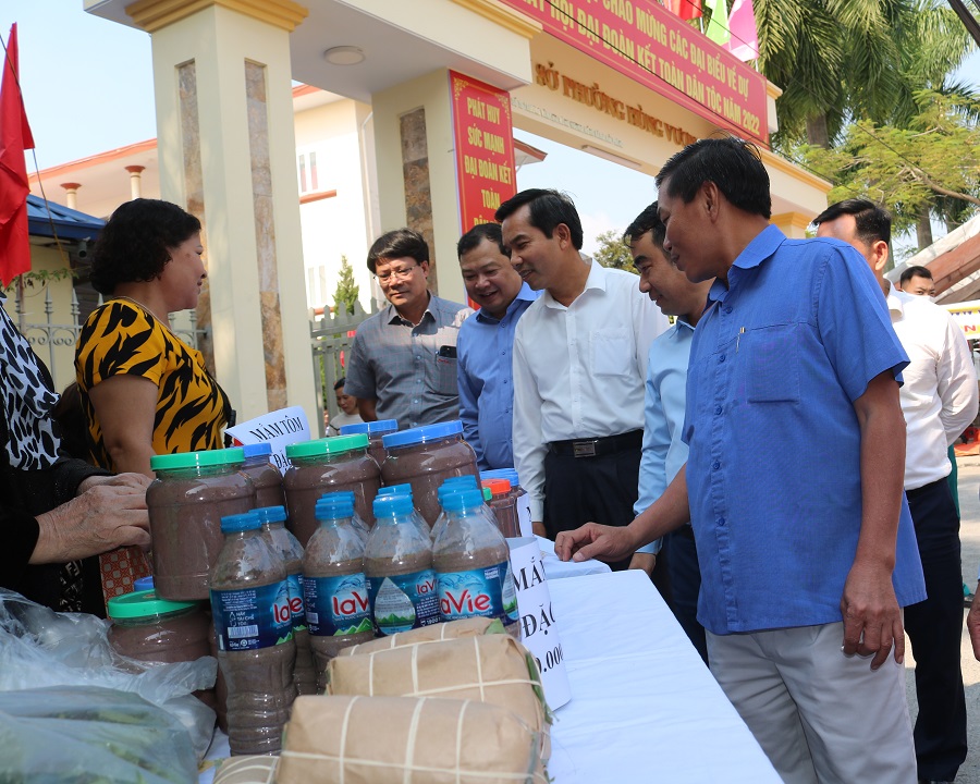 Các đồng chí lãnh đạo thành phố tham quan các gian hàng trưng bày “Hội chợ hàng Việt” tại ngày hội đại đoàn kết toàn dân phường Hùng Vương