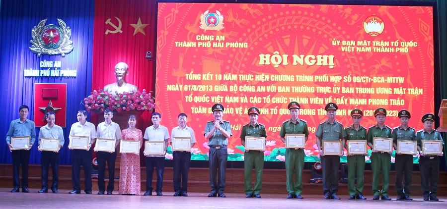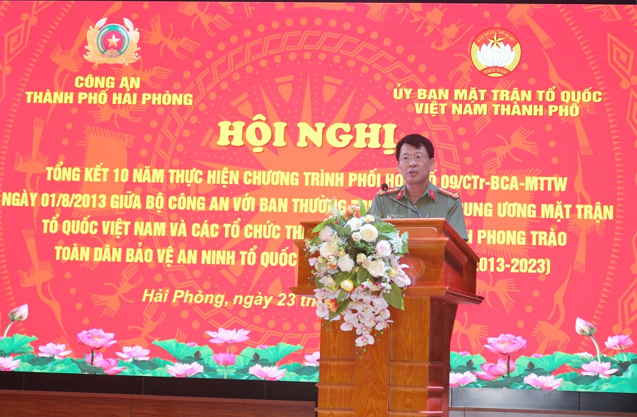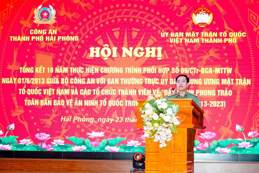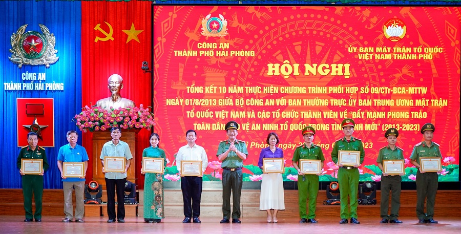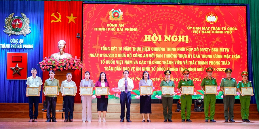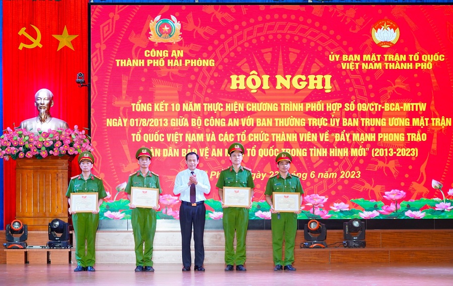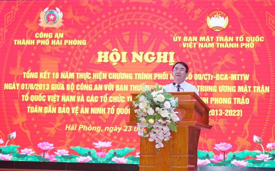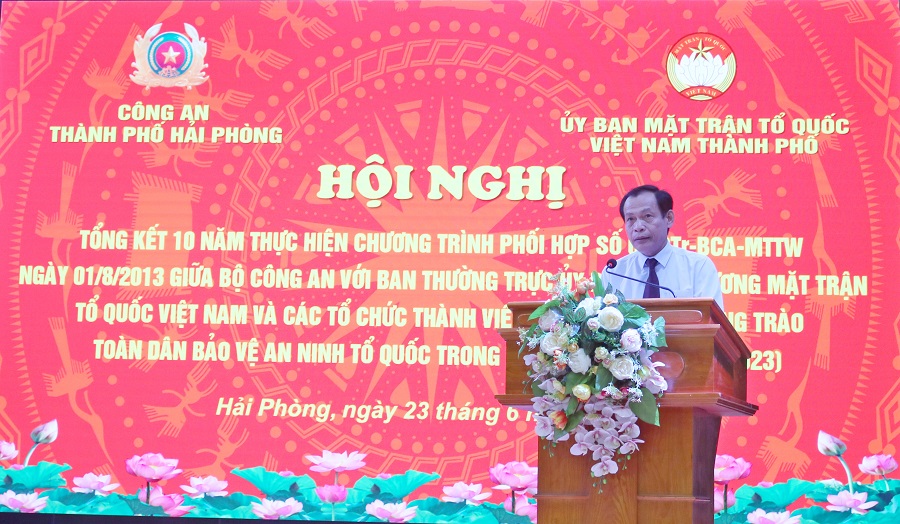 Chiều 23/6, Ban Thường trực Uỷ ban MTTQVN thành phố phối hợp Công an Hải Phòng tổ chức Hội nghị tổng kết 10 năm thực hiện Chương trình phối hợp số 09/CTr-BCA-MTTW ngày 01/8/2013 giữa Bộ Công an với Ban Thường trực Uỷ ban Trung ương MTTQVN và các tổ chức thành viên về “Đẩy mạnh phong trào toàn dân bảo vệ an ninh Tổ quốc” trong tình hình mới. Dự hội nghị có các đồng chí: Trần Quý Trường, Phó Cục trưởng Cục V05- Bộ Công an; Lê Khắc Nam, Thành uỷ viên, Phó Chủ tịch UBND thành phố – Trưởng Ban Chỉ đạo 799 thành phố; Đỗ Tràng Thành, Phó Chủ tịch Uỷ ban MTTQVN thành phố; Đại tá Đào Quang Trường, Phó Giám đốc Công an thành phố. Cùng dự có đại diện lãnh đạo các Ban Thành uỷ, HĐND, UBND, Uỷ ban MTTQVN thành phố, Công an thành phố cùng một số sở, ban, ngành liên quan.