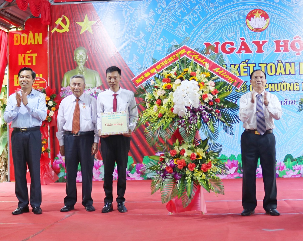 Đồng chí Cao Xuân Liên, Uỷ viên Ban Thường vụ Thành uỷ, Chủ tịch Uỷ ban MTTQVN thành phố tặng hoa chúc mừng Tổ dân phố số 2, phường Nam Hải, quận Hải An