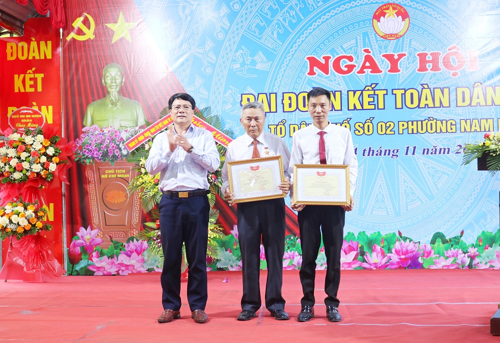 Đồng chí Bùi Văn Bắc, Phó Chủ tịch Uỷ ban MTTQVN thành phố Bằng khen cho các tập thể, cá nhân Tổ dân phố số 2 có thành tích xuất sắc