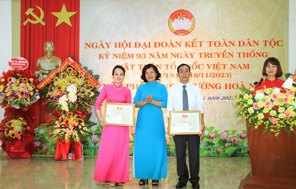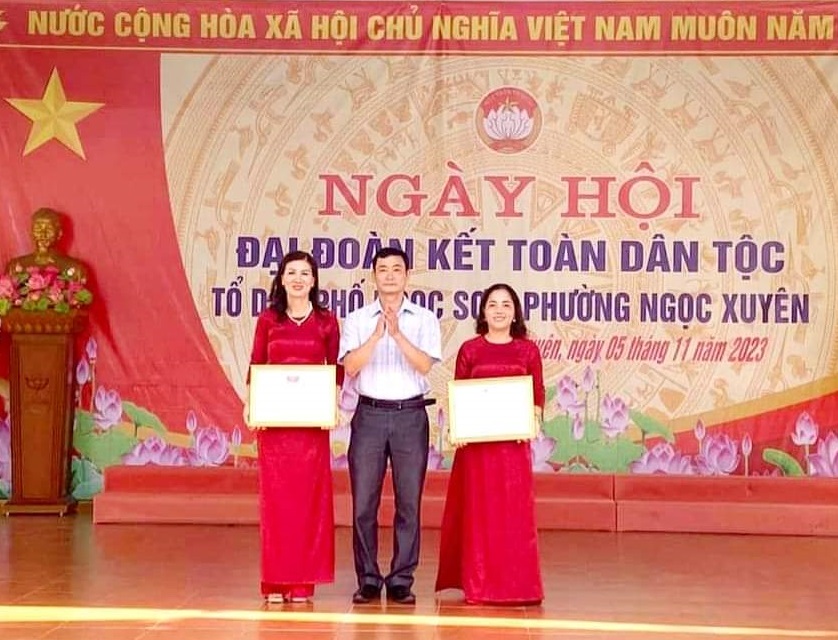 Đồng chí Phạm Thị Ngọc Hân, UVTT, Trưởng Ban Tổ chức – Tuyên giáo tặng Bằng khen cho các tập thể, cá nhân Tổ dân phố số 10, quận Dương Kinh có thành tích xuất sắc