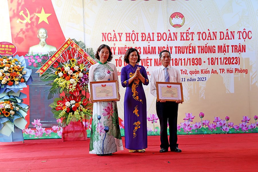 Đồng chí Vũ Thị Tĩnh, UVTT, Trưởng Ban Dân chủ – Pháp luật tặng Bằng khen cho các tập thể, cá nhân Tổ dân phố Lê Duẩn, quận Kiến An có thành tích xuất sắc